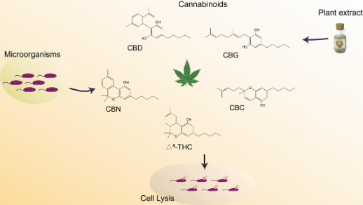 Fig. 1 Antimicrobial activity of cannabinoids like cannabidiol (CBD), cannabigerol (CBG), cannabichromene (CBC), cannabinol (CBN), and delta-8-tetrahydrocannabinol (Δ8-THC).