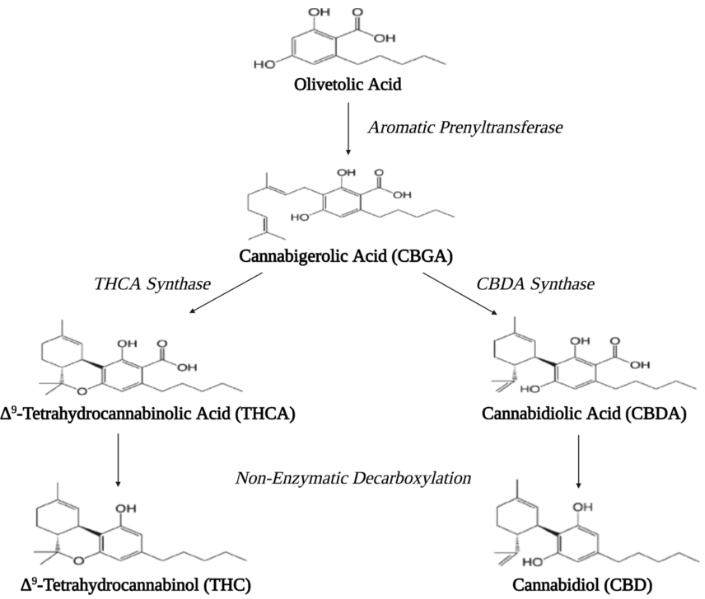 1. Biosynthetic Pathway Role:type III polyketide synthase (PKS) catalyzes the condensation of hexanoyl-CoA and malonyl-CoAs, producing a chain that cyclizes into OA. Subsequently, OA acts as a substrate for prenylation, forming CBGA, which is then converted to THCA or CBDA.