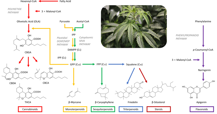 Biosynthesis pathways of cannabinoid, terpenoids, sterols, and flavonoids2,3,4.